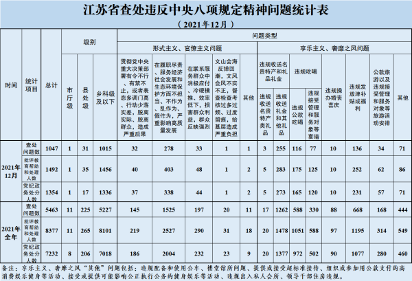 2021年12月,全省共查处违反中央八项规定精神问题1047起,批评教育帮助和处理1492人、其中给予党纪政务处分1354人。从问题类型看,查处形式主义、官僚主义问题345起、批评教育帮助和处理494人,查处享乐主义、奢靡之风问题702起、批评教育帮助和处理998人。从人员级别看,批评教育帮助和处理厅局级领导干部1人、县处级干部35人、乡科级及以下人员1456人。