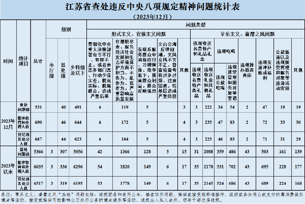 2023年12月,全省共查处违反中央八项规定精神问题531起,批评教育和处理690人、其中给予党纪政务处分667人。从问题类型看,查处形式主义、官僚主义问题131起、批评教育和处理185人,查处享乐主义、奢靡之风问题400起、批评教育和处理505人。从人员级别看,批评教育和处理县处级干部46人、乡科级及以下人员644人。