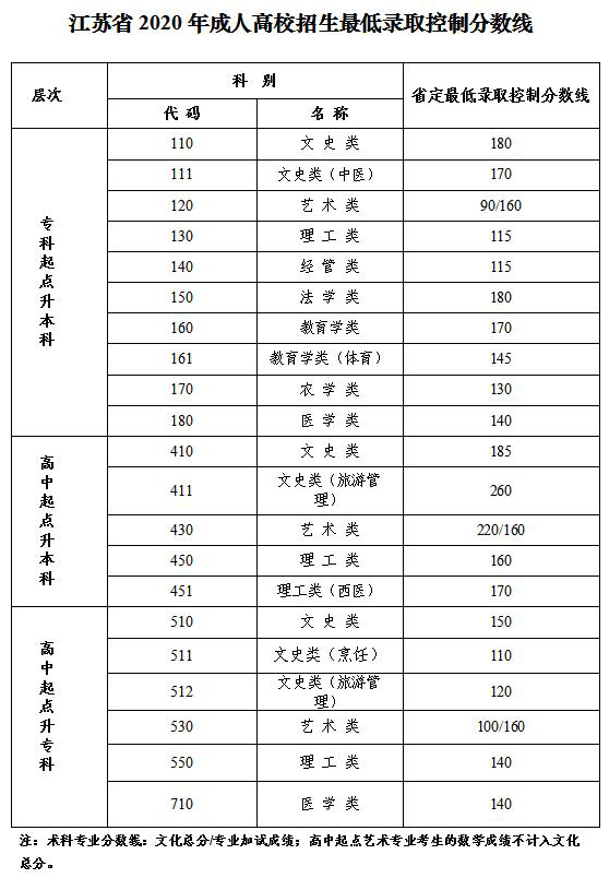 江苏省2020年成人高校招生最低录取控制分数线是根据成人高等教育对新生的基本要求,参照考生统考科目成绩和我省的招生计划,按学历层次和科类分别划定,经省教育厅批准,现向社会发布。(详见附件)。