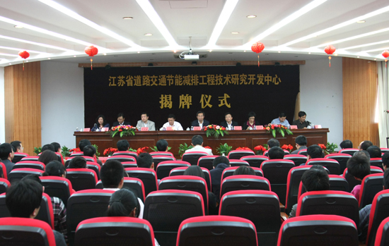 4月25日下午,“江苏省道路交通节能减排工程技术研究开发中心”揭牌仪式在学院明德楼报告厅隆重举行。江苏省教育厅殷翔文副厅长、交通运输厅金凌总工为中心揭牌。省发改委能源处戚玉松副处长,南京工业大学能源学院院长张红教授,省教育厅科技与产业处丁同玉副处长,交通运输厅科技处蒋振雄处长,省交通科学研究股份有限公司符冠华董事长,省交通科学研究股份有限公司副总裁曹荣吉高工,镇江江天汽运集团有限公司副总经理陈洪杰高工,省交通科学研究股份有限公司道路研究所所长张志祥博士等出席揭牌仪式。学院全体院领导、全体中层干部、部分师生代表参加了仪式。院党委孟祥林书记主持仪式。