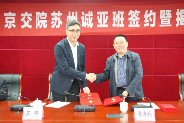 会上,周传林副院长和苏卿总经理共同签署了校企合作协议。韩京海副院长介绍了“南京交院苏州诚亚班”建设情况。苏卿总经理宣读了《关于表彰2018年度“苏州诚亚奖学金”获奖学生的决定》。周传林副院长和白云龙副总经理共同为5名获奖学生颁奖。