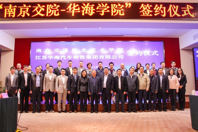江苏华海汽车销售集团有限公司连续五年进入“中国汽车流通行业百强企业”,是南京市汽车维修行业协会会长单位,公司旗下拥有6个汽车授权品牌,16家汽车4S店、1家直营店及1家钣喷中心。新成立的“南京交院-华海学院”依据当前国家职业教育现代学徒制理念,通过学校优秀专业资源与企业优秀资源的联合,理论教学与培训实践的结合,开展“双主体育人、一体化育人”的合作模式,采用“工学交替”办学模式,实现真正意义上的德国“双元制”。“南京交院-华海学院”采用“1+0.5+0.5+1”学制组织形式,学生先在学校完成1学年文化基础和专用基础知识的学习,然后在企业进行0.5学年的专业技能培养,再回到学校进行0.5学年的专业知识学习,最后1学年在企业顶岗实习。
