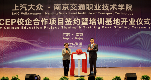 11月30日上午,上汽大众-南京交通职业技术学院SCEP项目签约暨培训基地开业仪式隆重举行。省交通运输厅副巡视员、机关党委书记陈萍;上汽大众SKODA售后服务高级总监钟仲秋,上汽大众VW品牌技术高级总监MR.Patrick Okeeffe等上汽大众代表;全国上汽大众合作兄弟院校代表;上汽大众汽车VW品牌和SKODA品牌经销商领导以及经销商代表;江宁高新区管委会副主任王宁邦;学院党委书记贾俐俐,院长张毅,副院长杨益明等出席活动。