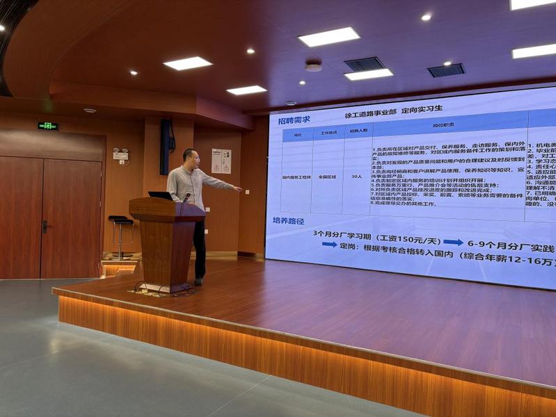 道路机械事业部李部长则聚焦本次招聘的具体需求,系统介绍了招聘岗位的工作职责、任职要求、薪酬福利体系、职业发展通道以及完善的培养模式。在互动环节,同学们就工作地点、晋升机制、面试流程等关切问题踊跃提问,李部长一一给予了细致耐心的解答,现场气氛热烈融洽。