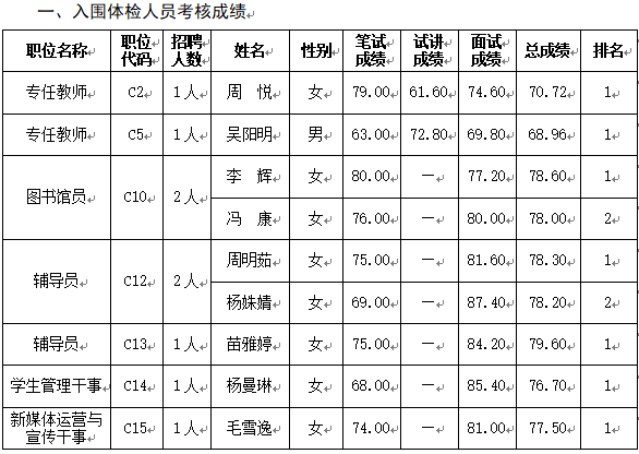 根据《南京交通职业技术学院2018年公开招聘工作人员(人事代理)公告》,经笔试、试讲(专任教师岗)、面试,按照综合成绩从高到低顺序,以1:1的比例确定体检人员名单,现将体检名单及事项安排公告如下: