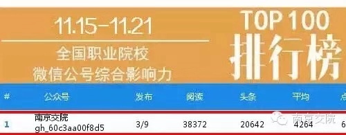 ★学院官方微信正式开通,多次入围全国前百。1月,“南京交通职业技术学院”官方公众微信平台正式开通,这是继学院官方微博发布后的又一新媒体。学院官方微信设置了“校园资讯”、“招生就业”、“文化园地”等栏目,是集资讯、服务以及综合为一体的新媒体平台。截至目前,学院官方微信已多次跻身《中国青年报》评选出的全国职业院校微信公号综合影响力TOP100,在11月15日至11月21日期间,跃升至全国职业院校微信公号综合影响力第一名。