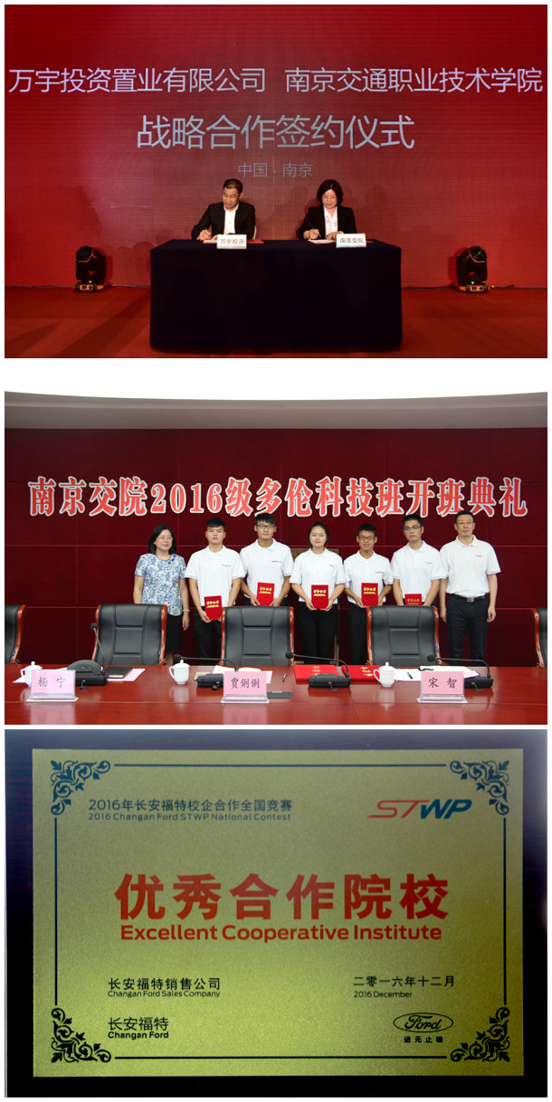 ★校企合作迈向深度融合。学院先后与南京万宇投资置业有限公司、四川升拓检测技术股份有限公司、江苏康众实业投资有限公司签定合作协议,在联合开展人才培养,共建生产性实训基地、产学研平台、混编师资团队方面,发挥自身优势,深度融合,推进校企融合培养人才。9月下旬,现代学徒制南京交院“多伦科技班”开班,成为学院探索现代学徒制人才培养的又一平台。12月上旬,在2016年长安福特校企合作工作交流暨全国竞赛总结会上,学院荣获2016年长安福特校企合作项目“优秀合作院校”、“模范教学质量奖”,多名教师获评“优秀项目负责人”、“模范教师”、“优秀教师”,多名学生获评“优秀学生”。12月中旬,学院与江苏省交通建设监理协会签订捐资助学协议,设立20万“交通工程建设教育奖励基金”。此外,上汽大众服务技术培训部与学院达成合作的共识,积极筹建上汽大众-南京交院培训中心,并依托培训中心资源,做好南京交院SCEP班学生的教学和上汽大众华东地区经销商员工的培训,为上汽大众华经销商培养具备扎实基础技术能力的售后服务人才。
