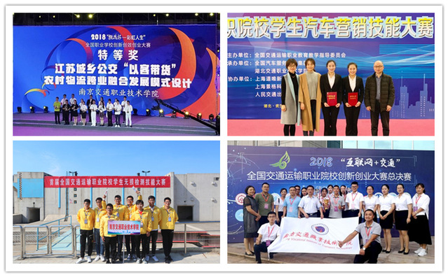 ★学院学子在省级以上赛事屡获佳绩。一年来,交院学子在各项省级以上赛事中成绩斐然,分别在2018年“挑战杯—彩虹人生”全国职业学校创新创效创业大赛决赛荣获特等奖,在2018年全国职业院校技能大赛新能源汽车技术与服务赛项中获一等奖,在首届全国交通运输职业院校学生无损检测技能大赛囊括所有单项赛事一等奖,在2018年全国职业院校技能大赛汽车检测与维修赛项中获一等奖,在2018年江苏省高等职业院校技能大赛中获得14块奖牌(一等奖5项,二等奖6项,三等奖3项),在全国“互联网+交通”创新创业大赛中获1金2银1铜,在第八届全国大学生市场调查与分析大赛专科组总决赛中获2个一等奖,在第八届华东区大学生CAD应用技能竞赛暨第三届华东区高校教师CAD应用教学竞赛中获2个团体一等奖,在2018年全国大学生数学建模竞赛中获江苏赛区一等奖,在“中英一带一路青年创新创业技能大赛”中国赛区总决赛中获二等奖,在第四届全国互联网+大学生创新创业大赛国赛选拔赛暨第七届江苏省互联网+大学生创新创业省赛决赛中获1个二等奖2个三等奖,在第十五届江苏省非理科专业高等数学竞赛中获奖率超出本次竞赛平均获奖率16个百分点。
