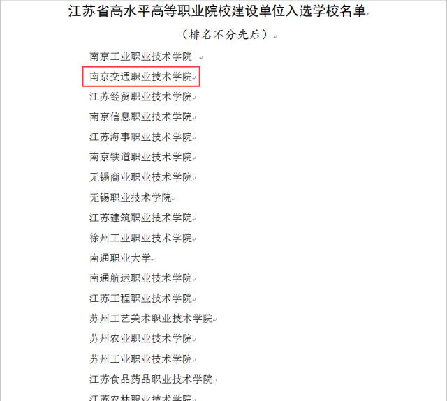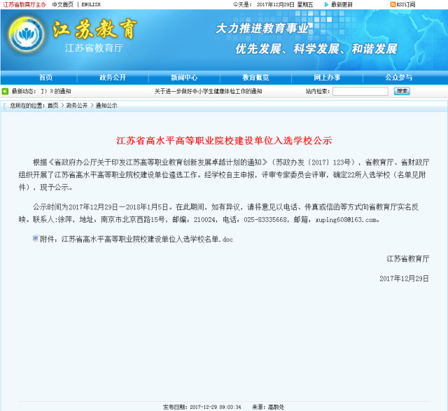 ★学院成功入选江苏省高水平高等职业院校建设单位。1月30日,江苏省教育厅、江苏省财政厅发布《关于公布江苏省高水平高等职业院校建设单位名单的通知》(苏教高〔2018〕2号),公布22所高职院校为江苏省高水平高等职业院校建设单位,学院成功入选。