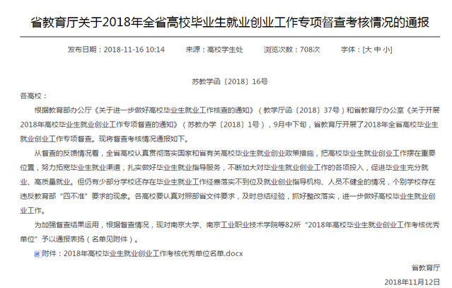 ★学院获评江苏省2018年高校毕业生就业创业工作考核优秀单位。11月12日,江苏省教育厅公布了2018年全省高校毕业生就业创业工作专项督查考核情况,学院以扎实的管理、显著的成效从全省本专科高校中脱颖而出,被评为“2018年高校毕业生就业创业工作考核优秀单位”。学院多年来毕业生就业率和就业质量始终保持较高水平,用人单位及毕业生满意度逐年增高,就业综合竞争力不断攀升。