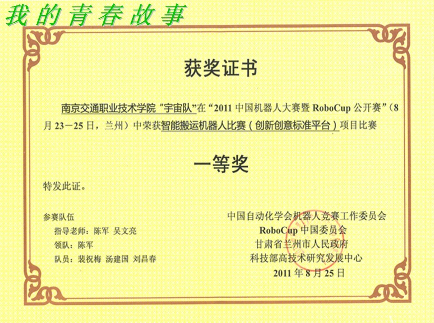 在学习中我从不敢半点怠慢,努力学习各门功课,对专业知识刻苦学习,加强自己的动手能力,与同学共同探讨,虚心向老师求教。“一分耕耘一分收获”,在我的不懈努力下先后获得学院三等奖学金两次,学院一等奖学金两次,素质拓展奖两次以及在各种文艺方面均获得若干奖项。学习中不局限于专业知识,在校期间还考取了许多其他技能证书比如电子CAD证,计算机等级证以及无线电装接工证等,积极参加各项技能大赛,分别在江苏省和全国中获得2011江苏省第四届“苏大杯”大学生机器人大赛分拣机器人比赛冠军;2011中国机器人大赛暨RoboCup公开赛 获智能搬运机器人比赛(创新创意标准平台)项目比赛一等奖。“天道酬勤”是我的一种信仰。