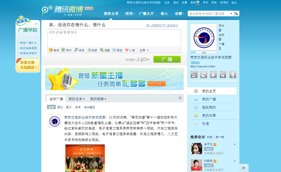 微博是一个表达和获得最新动态的即时广播平台,南京交通职业技术学院团委开通了腾讯微博了啊,请大家多多收听关注他的最新动态吧!