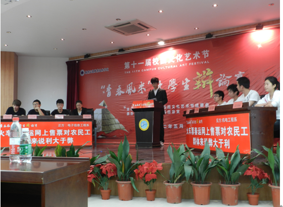 决赛在机电工程系代表队和电子信息工程系代表队之间进行。双方辩手就“火车票春运网上售票对农民工群体的利弊关系”展开了激烈的辩论。辩手们幽默犀利的言辞、激烈的语言交锋不时引起观众们会心的笑声和阵阵掌声。决赛还安排了互动环节,观众出其不意的提问、辩手们巧妙的回答,使得全场气氛相当活跃。