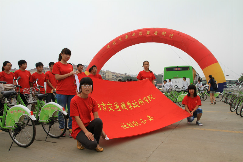 2012年9月22日世界无车日,南京交通职业技术学院社团联合会带领环保协会积极响应通盛客运公司“绿色交通与您健康同行活动”,进行了环城骑车活动.
