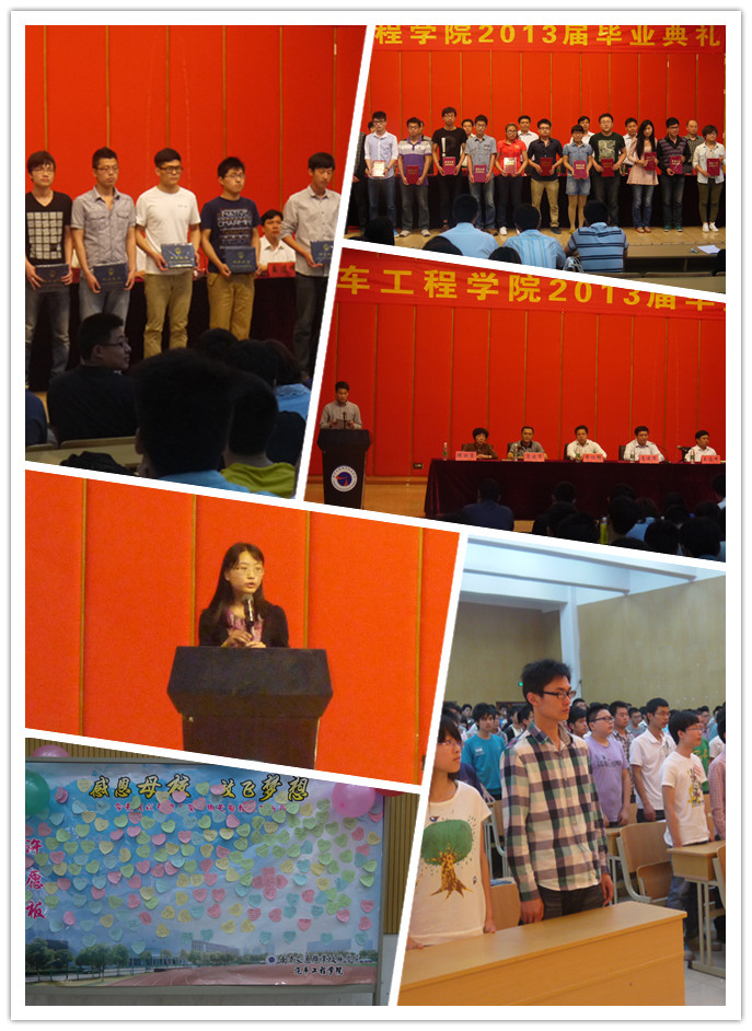 汽车工程学院文爱民院长在典礼上致辞,祝贺2013届469名汽车学子顺利毕业,并语重心长地对全体毕业生提出了殷切的期望;教师代表刘静老师发言,在回顾了与2013届毕业生们共同走过的日子后,代表全体老师向毕业生送去深深的祝福;毕业生代表101012班张兵兵同学回顾了三年的交院生活,由衷感谢学校的精心培育和老师的关心与帮助,表示要牢记学校教诲,踏入工作岗位后努力工作,回报母校。