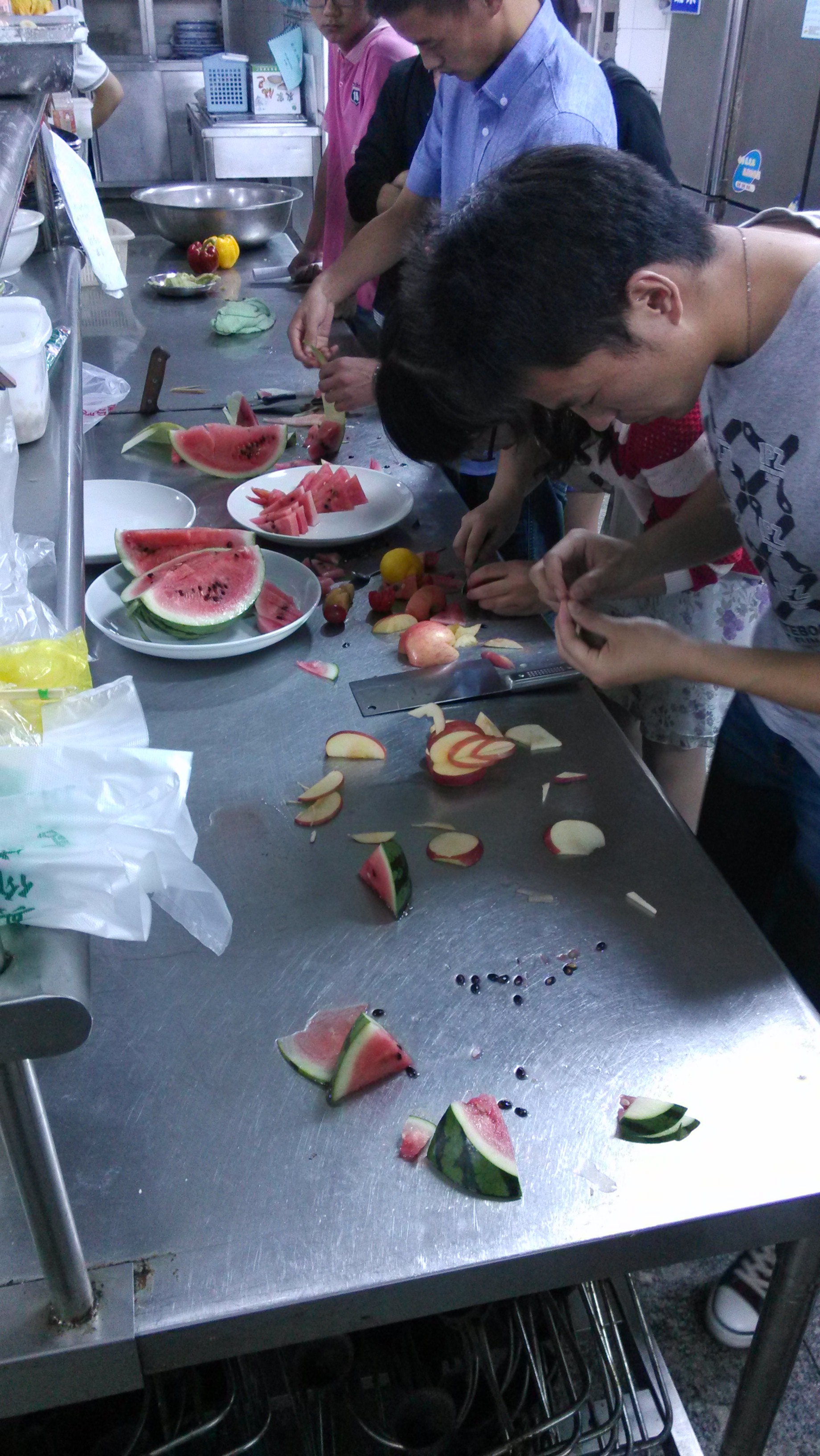 5月29日,美食社在三食堂举办了“小小美食家”厨艺大赛。比赛分美食知识问答与现场制作两个环节,参赛选手在了解健康饮食文化的同时,互相切磋厨艺,体味美食制作的趣味。在现场制作环节,参赛队员先以苹果、西瓜、圣女果、黄瓜、甜橙为材料制作了各色极具创意的水果拼盘,随后以牛肉为主要源料,配以洋葱、甜椒等辅料,巧妙购思,制作了道道色香味俱全的美食。经食堂师傅的试吃与评比,运输管理学院获第一名,人文艺术系获第二名,路桥与港航工程学院获第三名。