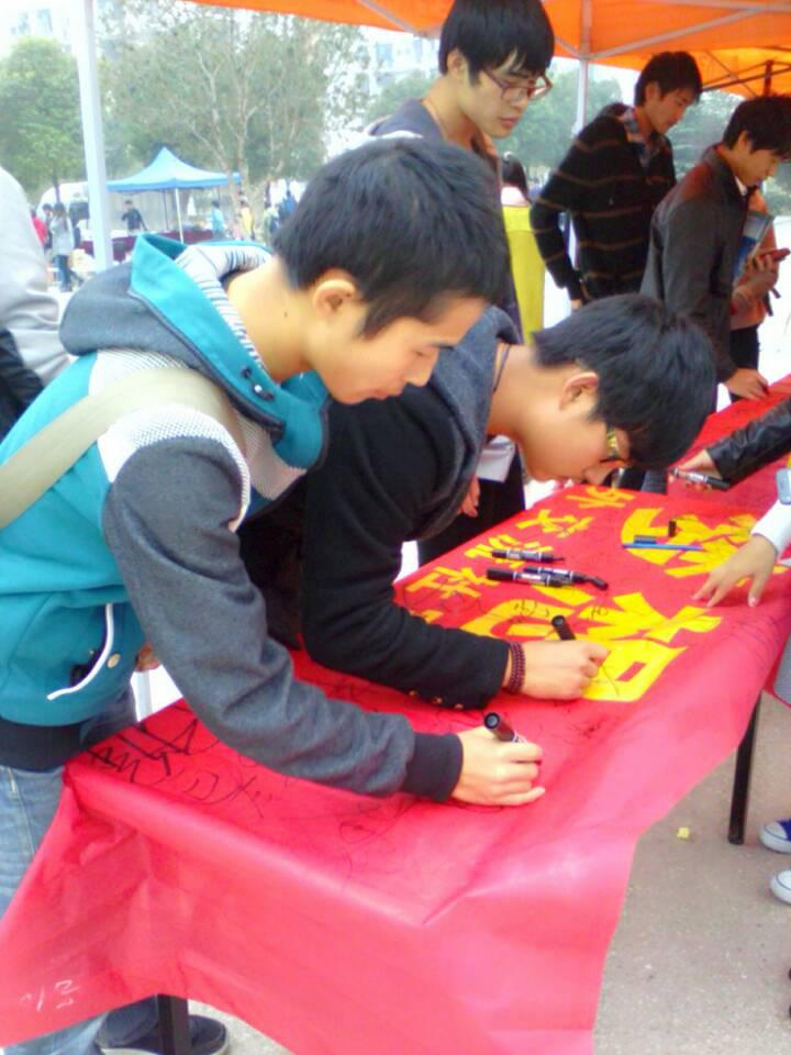 在这个金秋送爽的季节里,大学生中外交流社于11月13日在思源堂举办了一场横幅签名送祝福活动。