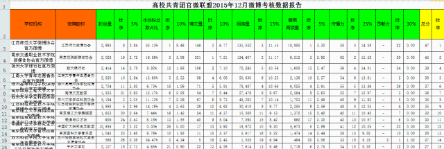 2015年下半年以来,团省委牵头成立了高校共青团微博联盟,我院团委和新媒体协会官方微博加入该联盟。近日,根据团省委发布的考核数据,截止12月31日,我院新媒体协会微博综合排名位列全省第二,其中博文量排名第一、本校粉丝数比例排名第三、阅读量排名第二、最高阅读量排名第三、传播力排名第二。