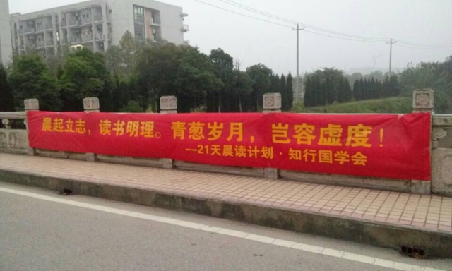 2016年11月7日至11月27日,在清源湖畔,国学社开展了“21天晨读计划”。在国学社社长罗毅的带领下,同学列队散开齐声朗诵《弟子规》《三字经》《千字文》《孝经》《大学》《中庸》《论语》等国学经典。同学们朗朗诵读声伴着早晨的太阳冉冉升起,阳光洒在同学身上,寒冷也一驱而散。