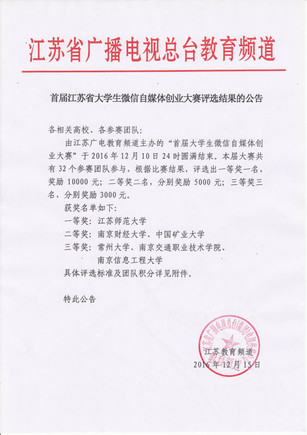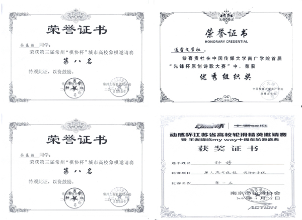 摄影协会选送的作品在江苏省“最美校园”评比中获得优秀奖;翰轩棋社参加第三届常州“棋协杯”城市高校象棋邀请赛,获得团体第二名,1名同学获得个人第八名;通哲文学社获得南京十五高校中华经典诵读大赛优秀奖,参加兄弟院校原创诗歌大赛获得优秀组织奖;新世纪足球社在江宁区高校足球赛中获得第四名;新媒体协会在江苏省广播电视总台教育频道首届大学生微信自媒体创业大赛中获得三等奖;辩论与演讲协会获得“青春与梦想”南京市大学生演讲比赛三等奖;轮滑社团参加省高校轮滑经营邀请赛,包揽了单人花式绕桩女子组第一名、速度过桩女子组第一名、花式对抗女子组第一名。这些成绩充分展示了社团建设发展和教师指导的成果。