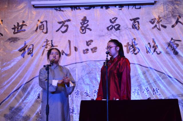 晚会在爵士舞团劲辣火热的开场舞中拉开帷幕,中国药科大学众乐相声社的社员为我们带来了一场诙谐逗趣的相声表演——《智力测验》,一段新颖而奇特的相声《量子力学与广义相对论相声表演的指导与应用》令人耳目一新。我院学子的小品《超级应聘》令人捧腹,相声《白蛇传》亦妙趣横生。金陵科技学院话剧社社员表演的《断腕》,表演得惟妙惟肖。建筑工程学院和汽车工程学院合作表演的小品《天波风云》让同学们在欢声笑语中,体会到美好生活的来之不易。江苏海事职业技术学院相声社的社员们为我们带来了改编相声《清明奇遇》,精彩的表演将晚会推向高潮。