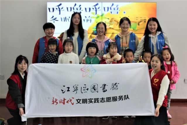 2019年4月13日,“信韵姐姐”来到江宁区图书馆总馆,通过表演的形式给小朋友讲述绘本故事“呼噜呼噜,冬眠之前”,帮助小朋友们认识了大中小,长短高矮,告诉孩子们乐于助人的快乐和意义,通过阅读将雷锋精神的种子种植在孩子们的心里。“信韵姐姐”和孩子们一起跳了“小兔子盖新房”手舞操,通过舞蹈的形式,帮助孩子更快、更好的理解绘本内容。同时,信韵星志愿者们帮助图书馆一起整理书籍,协助市民完成借阅手续。