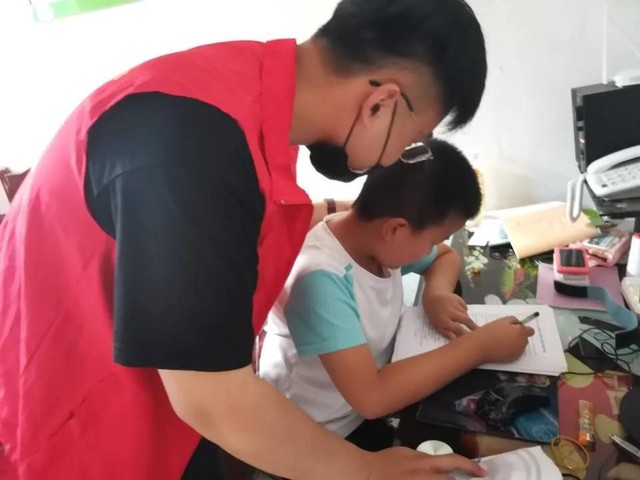 图为志愿者询问家长生活和教育脱贫情况