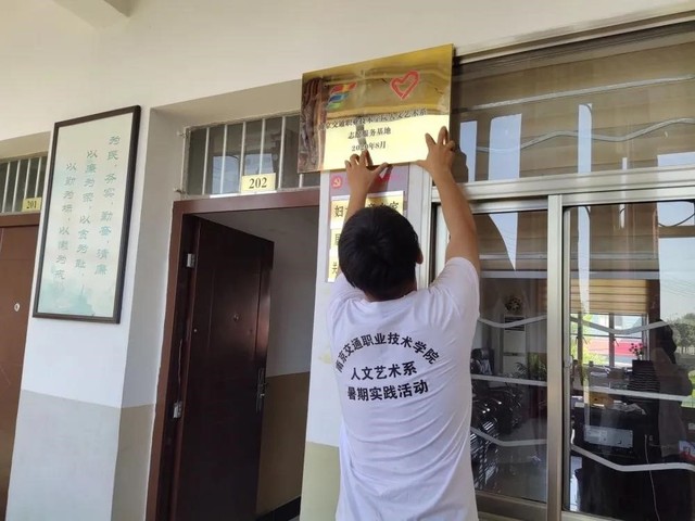 8月15日,校地双方在扬州市邗江区公道镇埝桥村举行简单而隆重的揭牌仪式,人文艺术系实践团代表罗逊与埝桥村团委书记陈云共同为“志愿服务基地”揭牌。