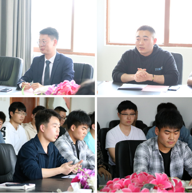 王雪琴老师带领参会人员一起学习了习近平总书记在清华大学建校110周年大会讲话;毕业生代表、中共预备党员1810412班迟文俊,中共党员1810211郭津分享了自己的青春故事;团员青年代表1910113班 喻飚、1910413班万顺两位同学围绕继承弘扬“爱国、进步、民主、科学”的五四运动精神进行了交流发言;全体人员与三位新团员一起举起右拳,面对团旗庄严宣誓,重温入团誓词。