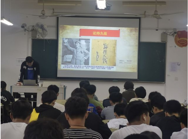 朱航勇同学讲述的《论持久战》是毛泽东1938年5月26日至6月3日在延安抗日战争研究会上所做的讲演。该讲演全面分析了中日战争所处的时代和中日双方的基本特点,并从全国的战略全局出发,深刻地论述了抗日战争是持久战,必须经过战略防御、战略相持、战略反攻三个阶段,从而揭示了抗日战争发展的过程和规律,批驳了“亡国论”和“速胜论”。《论持久战》是中国共产党领导抗日战争取得胜利的纲领性文献。学院党总支副书记王琼老师参加活动,并对两位同学的宣讲进行点评。