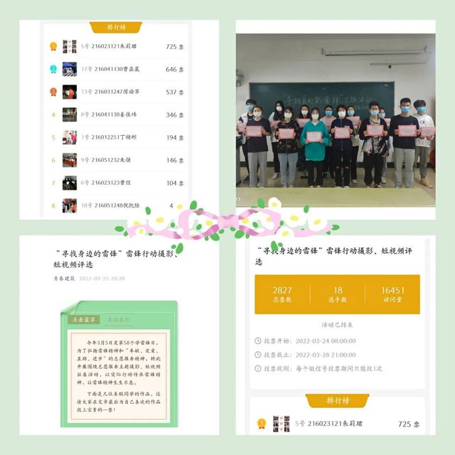 同学们从身边的小事入手,用摄影、短视频记录自己或身边人的志愿服务行为,用镜头寻找身边的雷锋,以小记者的身份弘扬雷锋精神,成为雷锋精神的践行者。此次作品征集活动为期14天,共征集摄影照片101张,短视频5个,通过在建筑工程学院微信公众号投票及线下评委打分,综合评选出一、二及优秀奖共18份作品,其中:一等奖三名(216023121朱莉珺、216041130曹鑫晨、216031247厉瑜苹);二等奖五名(216041138姜佳玮、216012251丁储彬、216051232朱强、216023123曹煜、216051248倪凯陆);优秀奖十名(216011233吴宁清等)。
