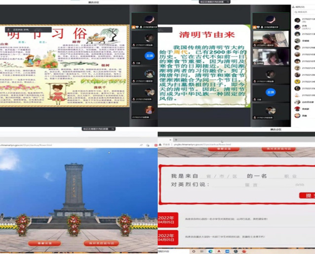 各支部通过线上视频播放、故事分享、唱革命歌曲、看红色短视频等多种方式使同学们进一步了解清明节的由来和习俗,阐释新时代褒扬烈士的重大意义,展示革命英烈浴血奋战艰苦卓绝的奋斗历程。同学们通过“云端扫码”向先烈鞠躬献花、签名寄语,表达对革命先辈们的深切怀念和崇高敬意,表达坚决践行“学习革命先辈崇高精神,争做又红又专时代新人”,为中华民族的伟大复兴努力奋斗的决心和意志。