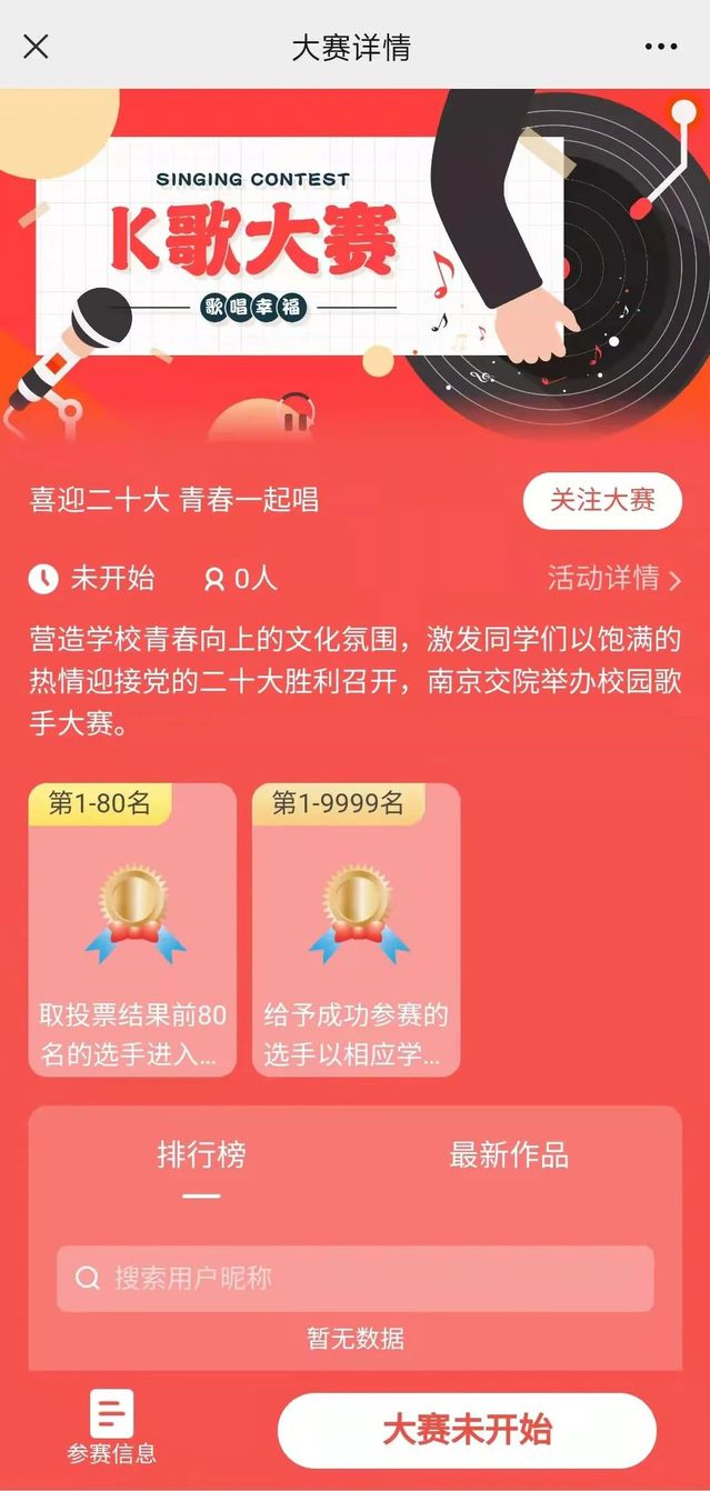 1、参赛形式可以是独唱、对唱等形式,参赛歌曲音乐形式不限,歌曲内容要求健康、积极向上,充满青春正能量。