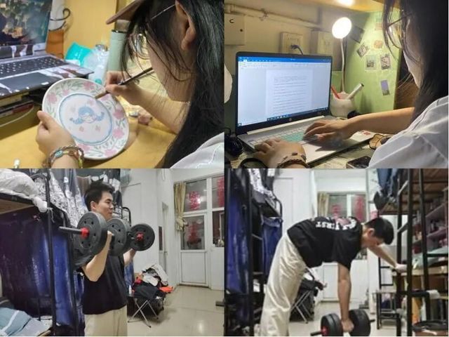 人文艺术系同学在宿舍内的生活也很丰富多彩。领略艺术之美的同时不忘健身锻炼,增强体魄。