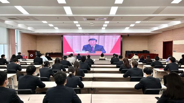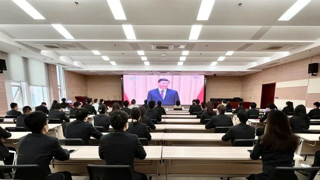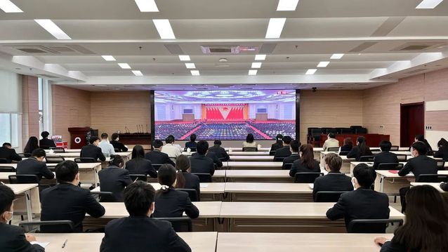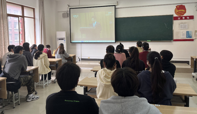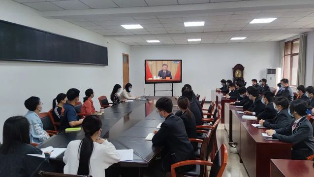 学院党委书记贾俐俐、副院长王道峰,党委宣传部、团委负责同志及各院系团总支书记,学生会代表、青年学生代表在图书馆B203集中观看庆祝大会直播,其余师生纷纷通过手机、网络、“两微一端”等多种形式认真收听收看大会盛况直播,深刻学习领会习近平总书记重要讲话精神,为建团百年送上最诚挚的祝福。