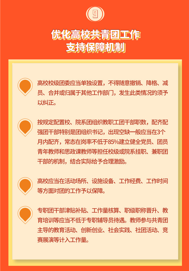 文件指出,高校共青团工作是高校党的建设和思想政治工作的重要组成部分,事关落实教育立德树人根本任务,事关共青团履行为党育人政治职责。要健全完善高校党建带团建具体机制,高校党委应当拿出极大精力抓共青团工作,将高校共青团工作纳入学校党的建设和思想政治工作总体格局,明确团组织在学校思想政治工作中的具体职责。建立学生党员在基层一线为党做青年工作、发挥模范带头作用的机制,有学生党员的学生团支部原则上由学生党员担任团支部书记。优化工作支持保障机制,高校应当单独设置校级团委,配齐配强团干部特别是团组织书记,在活动场所、设施设备、工作经费、工作时间等方面对团的工作予以保障。