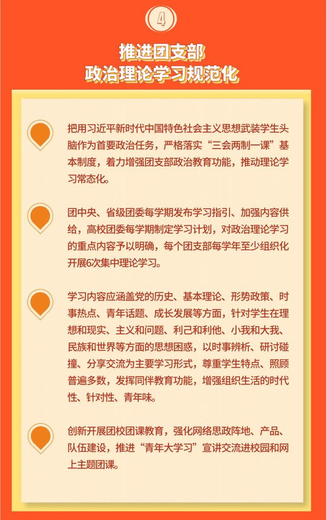 文件要求,要推进团支部政治理论学习规范化,把用习近平新时代中国特色社会主义思想武装学生头脑作为首要政治任务,严格落实“三会两制一课”基本制度,着力增强团支部政治教育功能,推动理论学习常态化。开展经常性、有组织的社会实践,统筹校内校外共青团组织资源,以团支部为基本单位,有计划、大批量、小规模、经常性地组织青年学生开展社会观察和实践,培养家国情怀,增长社会化能力。持续提升共青团员的精神素养和斗争本领,引导团员到祖国最需要的地方和基层一线建功立业,在社会生活中彰显奋斗精神、体现团员先进性。加强团支部组织机制建设,牢固树立工作到支部、到团员的鲜明导向,强化团支部作为共青团工作基本单元的功能,做到团员主要的学习实践活动由支部组织、政治骨干由支部推荐、团内荣誉由支部评议、帮扶对象由支部推选。