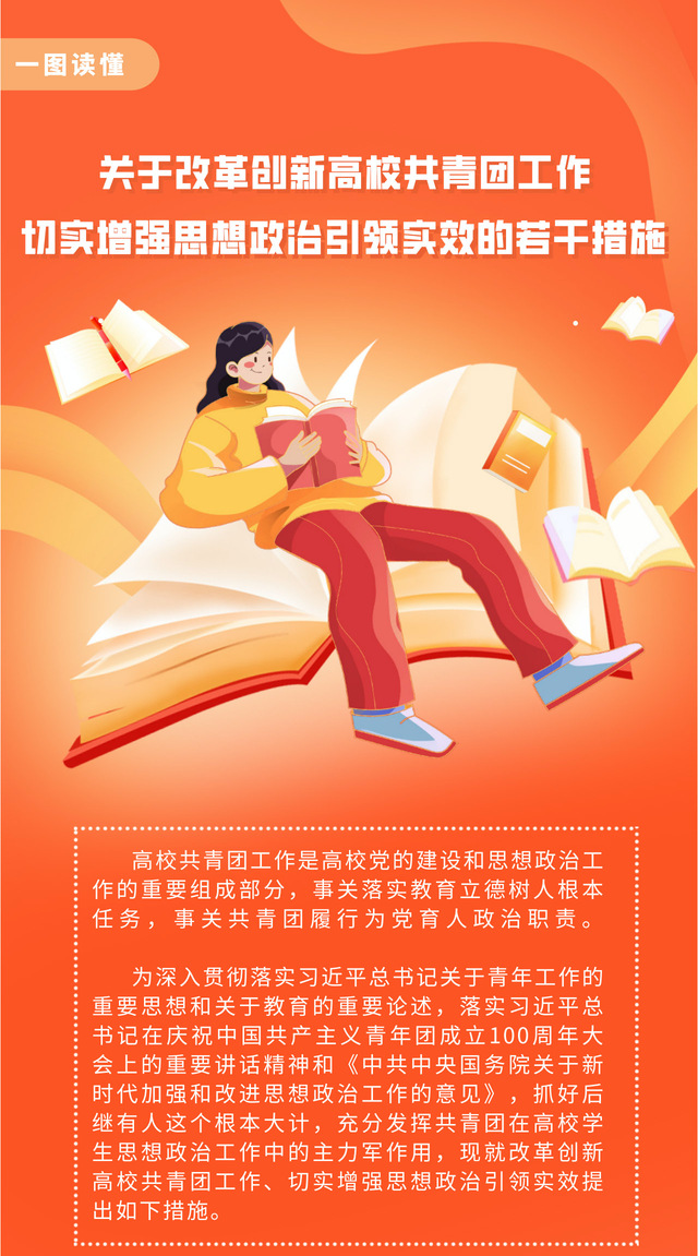 为深入贯彻习近平总书记关于共青团在高校学生思想政治工作中要发挥主力军作用的重要要求,近日,共青团中央、教育部党组印发了《关于改革创新高校共青团工作 切实增强思想政治引领实效的若干措施》,并发出通知,要求各地区各高校抓好贯彻落实。