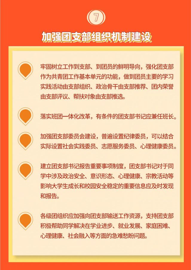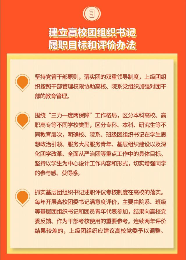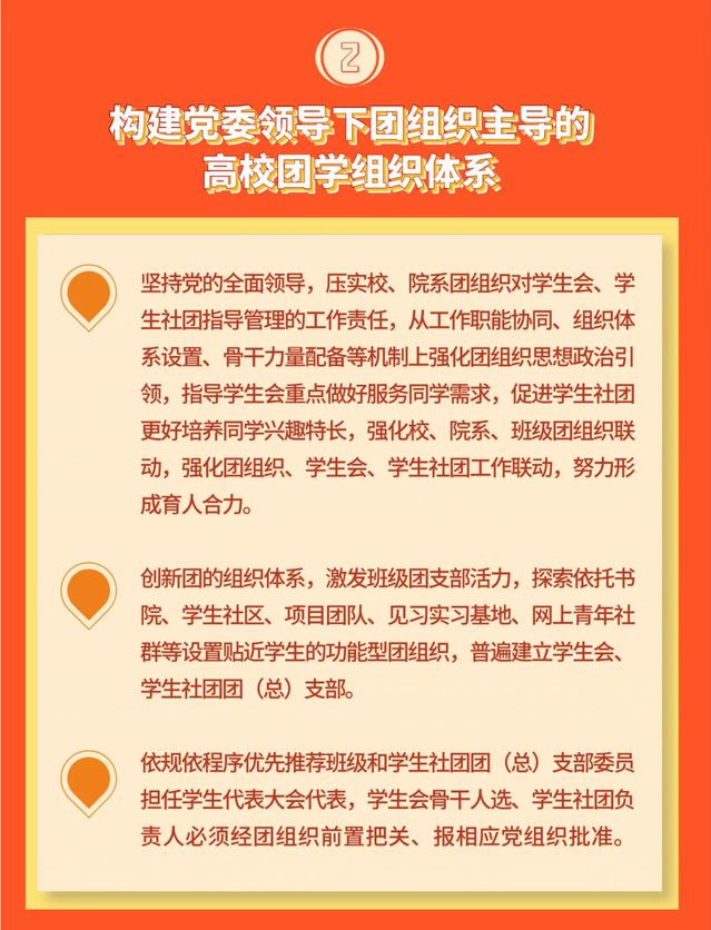 文件强调,要构建党委领导下团组织主导的高校团学组织体系,坚持党的全面领导,强化团组织的政治功能,压实校、院系团组织对学生会、学生社团指导管理的工作责任,从工作职能协同、组织体系设置、骨干力量配备等机制上强化团组织思想政治引领,指导学生会重点做好服务同学需求,促进学生社团更好培养同学兴趣特长,努力形成育人合力。建立高校团组织书记履职目标和评价办法,明确校、院系、班级团组织书记具体目标,坚持以学生为中心设计工作内容和形式,抓实基层团组织书记述职评议考核制度在高校的落实。