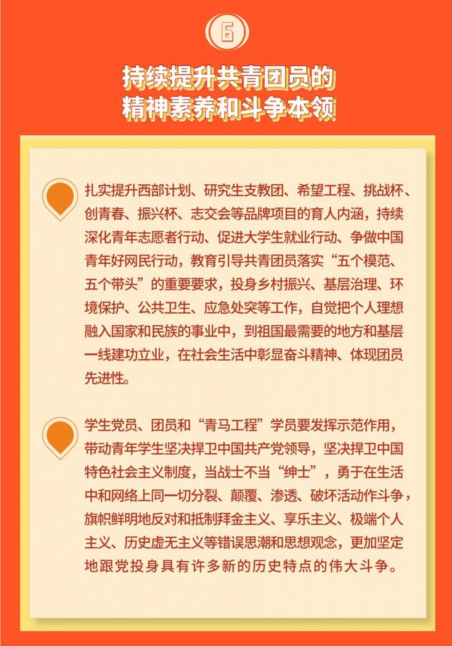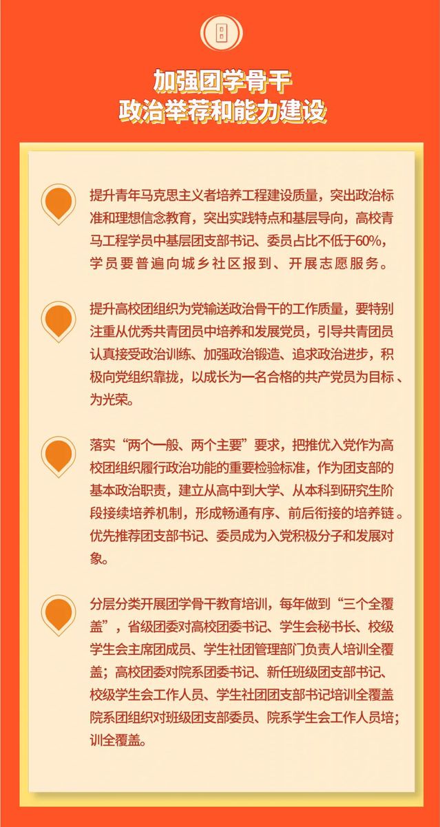 文件强调,要加强团学骨干政治举荐和能力建设,提升青年马克思主义者培养工程建设质量,突出政治标准和理想信念教育,突出实践特点和基层导向。提升高校团组织为党输送政治骨干的工作质量,落实“两个一般、两个主要”要求,把推优入党作为高校团组织履行政治功能的重要检验标准,作为团支部的基本政治职责,建立从高中到大学、从本科到研究生阶段接续培养机制,形成畅通有序、前后衔接的培养链条。分层分类开展团学骨干教育培训,每年对高校各级团组织、学生会、学生社团负责人和相关工作人员实现全覆盖。