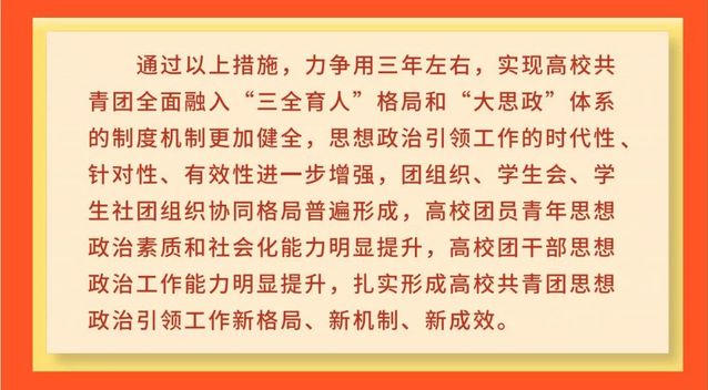 文件提出,力争用三年左右,实现高校共青团全面融入“三全育人”格局和“大思政”体系的制度机制更加健全,思想政治引领工作的时代性、针对性、有效性进一步增强,团组织、学生会、学生社团组织协同格局普遍形成,高校团员青年思想政治素质和社会化能力明显提升,高校团干部思想政治工作能力明显提升,扎实形成高校共青团思想政治引领工作新格局、新机制、新成效。