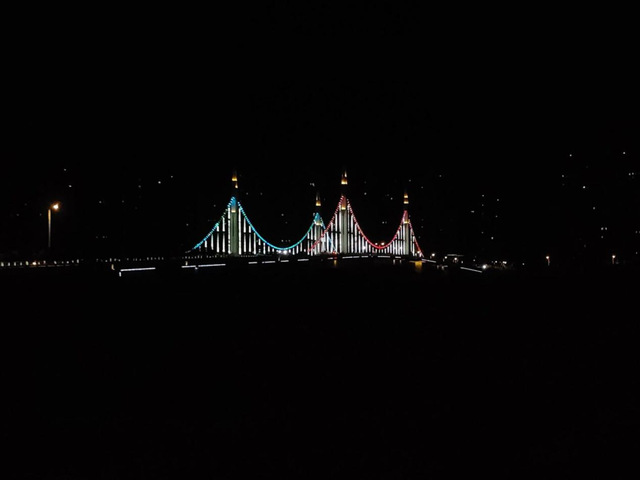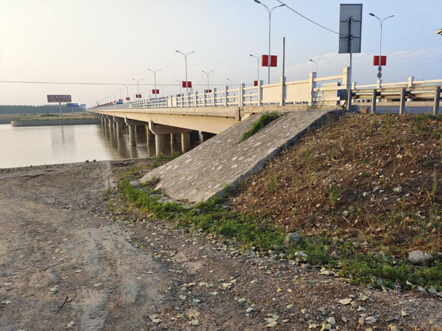 探寻完新沂河大桥后,团队成员任新龙乘着夜幕来到沭阳的金水桥。金水桥工程是县政府年度为民办实事项目之一,总投资7600余万元。该工程主要包括主桥、辅桥以及道路接线等。主桥横跨金水河,全长80米,辅桥两侧各50米,皆为连续梁结构;引桥两侧各32米,为2×16米跨空心板梁结构。桥梁总宽45米,桥梁设计荷载为城市A级。极大改善南部新城区交通条件,切实解决群众出行难题。