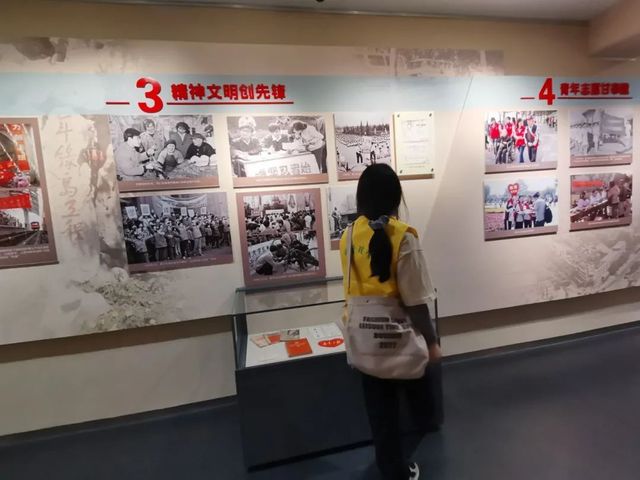 展厅里陈列了不同时期青年发挥的作用以及不同时代的青年风貌。广大青年始终跟党奋进,冲锋在前,成为建设新中国历程上不可或缺的一份力量。在这里调研团成员感叹道:无论是党的发展还是团组织的发展都不是一帆风顺的,是曲折的,是需要付出血与生命的代价的。感谢前人的付出,才得以让我们生在阳光下,长在春风里。心向党、正青春。正如这句话所说,要毫不动摇地坚持中国共产党的领导,树立远大理想,热爱伟大祖国,担当时代责任,让青春在为祖国、为人民、为民族、为人类的奉献中焕发更加绚丽的光彩。团队指导老师补充道:应该带领同学们来实地体会团组织的发展不易,他们才会在日常工作中更加自发地参与团组织活动,并自然而然地带上一股自豪感。