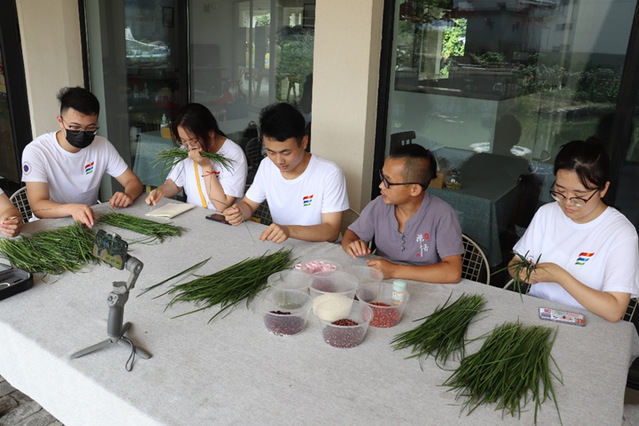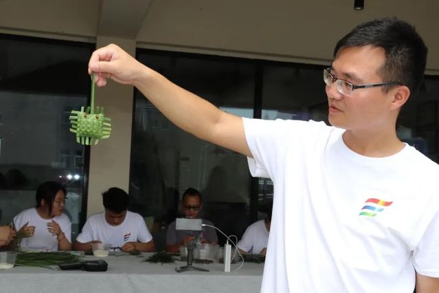 当天上午,调研团全体成员跟随当地非物质文化遗产传承人吴治平老师学习了包螃蟹形状的粽子和剪纸。吴老师向同学们详细地介绍了包螃蟹形状粽子的由来、所需的原材料和寓意,并手把手教同学们如何包螃蟹形状的粽子,团队成员在学习的过程中深深地感受到中国传统编织手艺的魅力以及如何推陈出新,将传统手艺与现代元素相结合,真正做到守正创新,将老一辈的手艺在年轻人中发扬光大。在剪纸时,吴老师带领同学们学习了如何剪中国传统的“喜”和“福”字,团队成员在学习的过程中也深刻感受到中国传统剪纸手艺的独特光彩和无与伦比的吸引力。大家纷纷表示,在今后的学习和生活中,定会将这两种非遗文化传承下去并引领更多人去学习和弘扬更多的非遗文化。