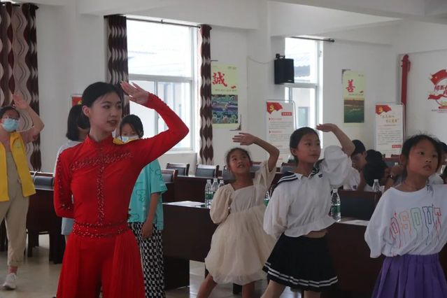 在团队成员邢正清的带领下,通过教、学、唱等方式,与当地青少年一起学习演绎了《红领巾心向党》、《万疆》、《我和我的祖国》等经典歌曲。队员们首先向青少年讲解了歌曲背后的红色故事,讲解了万里山河,仁爱无疆的爱国爱党之情,讲解了党中央领导实施乡村振兴的有关工作情况,大家听得聚精会神、津津有味。随后实践队成员耐心讲解演示,逐一分解带领学习舞蹈动作动作。音乐响起,小朋友们跟随着音乐节奏,学习模仿着舞蹈动作,各个精神饱满、热情洋溢,沉浸其中。