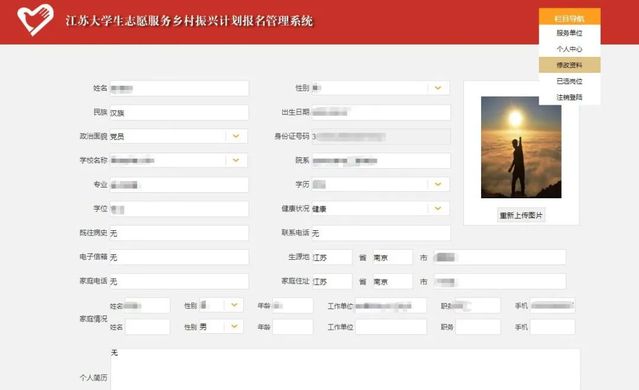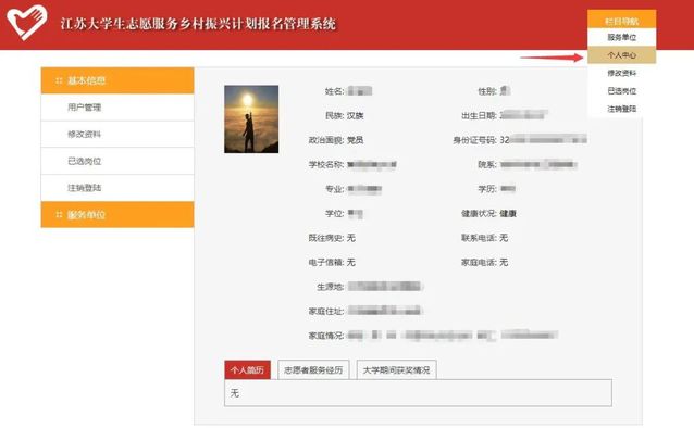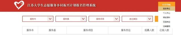 栏目导航分为服务单位、个人中心、修改资料、已选岗位和注销登陆五个目录。