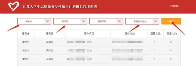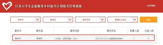 依次选择“南京市”、“高淳区”,点击查询按钮,即可查看服务地所有岗位信息;选中“普通批次岗位”,查看可报名岗位。