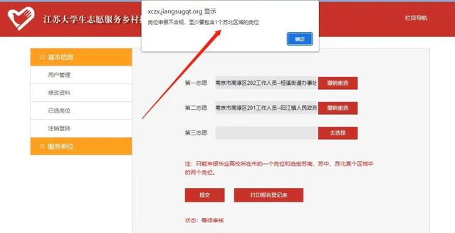 注意:每位符合条件的大学生最多可申报3个服务岗位,至少涉及苏北(徐州、淮安、盐城、连云港、宿迁)、苏中(南通、泰州、扬州)、苏南(南京、苏州、无锡、常州、镇江)中2个区域,并确保在苏北区域有申报服务岗位。