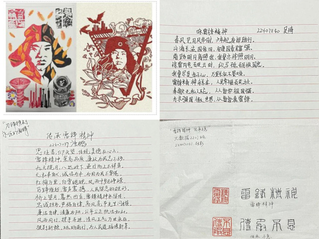 电子信息工程学院于4月举办“刀笔镌刻永恒的雷锋”文艺文创作品大赛。同学们积极参与投稿,上交作品30余幅。作品有书法类、摄影类、艺术设计类和绘画类等。同学们的作品各展千秋,形式多样,色彩鲜明,展现了电子信息工程学院学生们深厚的文化素养。