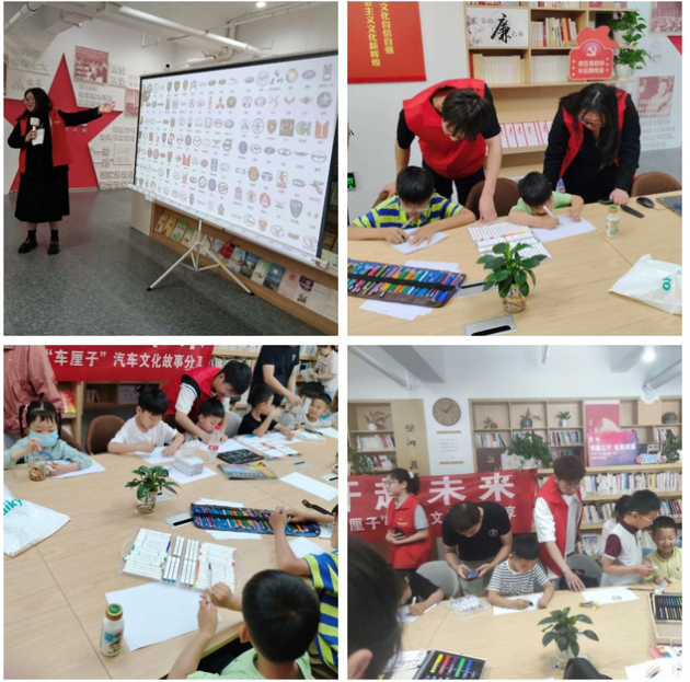 在实践环节,志愿者们带领小朋友们了解汽车品牌车标的样式和含义,引导大家手脑并用,动手画一个属于自己的车标。小朋友们拿出画笔,天马行空,志愿者们在一旁辅助年龄较小的孩子,帮助他们完善自己的车标绘画作品。